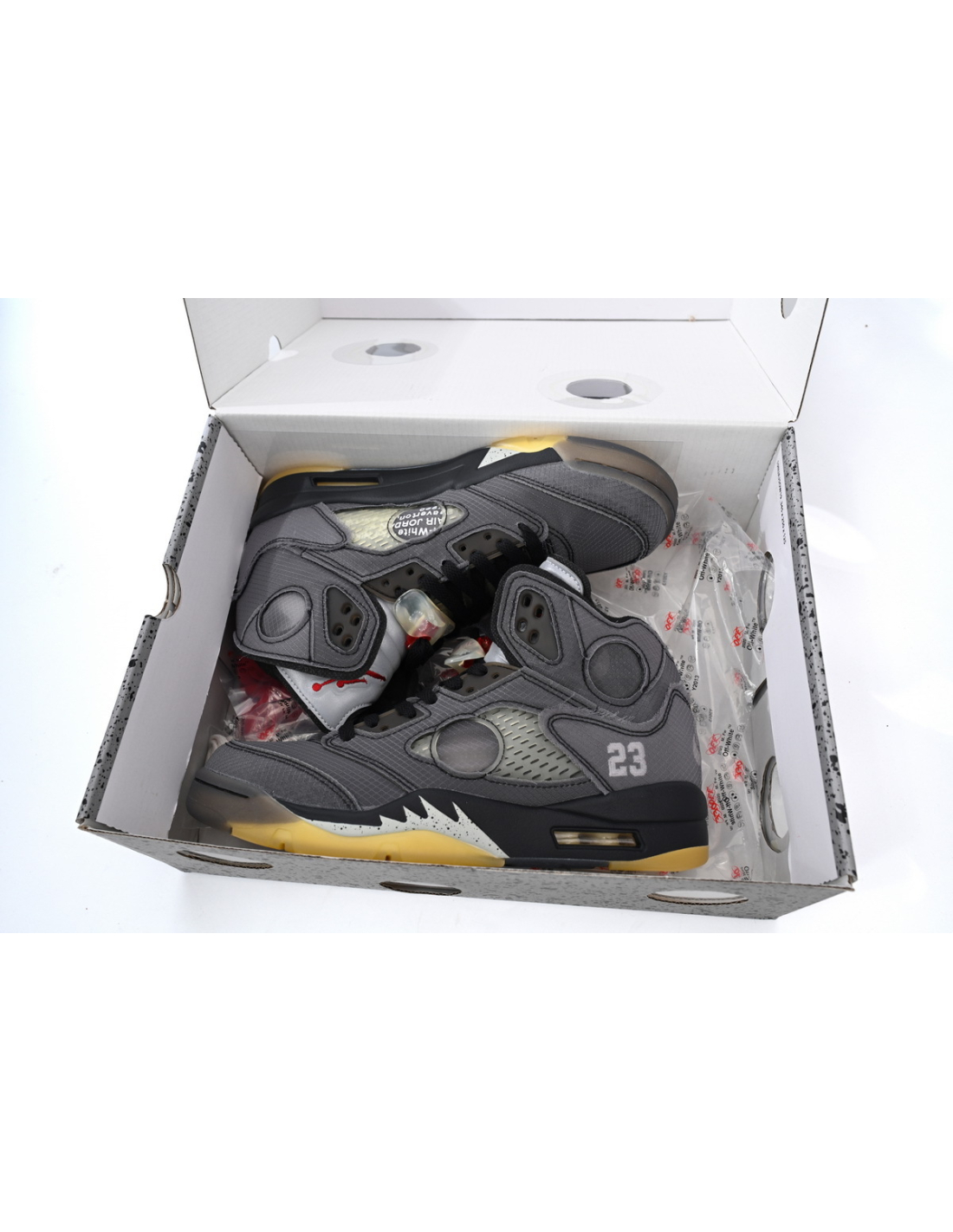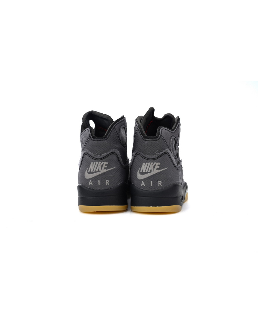 These groundbreaking sneakers from Our Shoes showcase Virgil Abloh's revolutionary take on the Jordan 5 silhouette. Featuring premium black suede with translucent mesh panels, the signature fire-red midsole accents and deconstructed tongue complement the industrial-inspired details, creating an avant-garde interpretation of the classic Jordan 5 that maintains its basketball heritage while pushing creative boundaries.