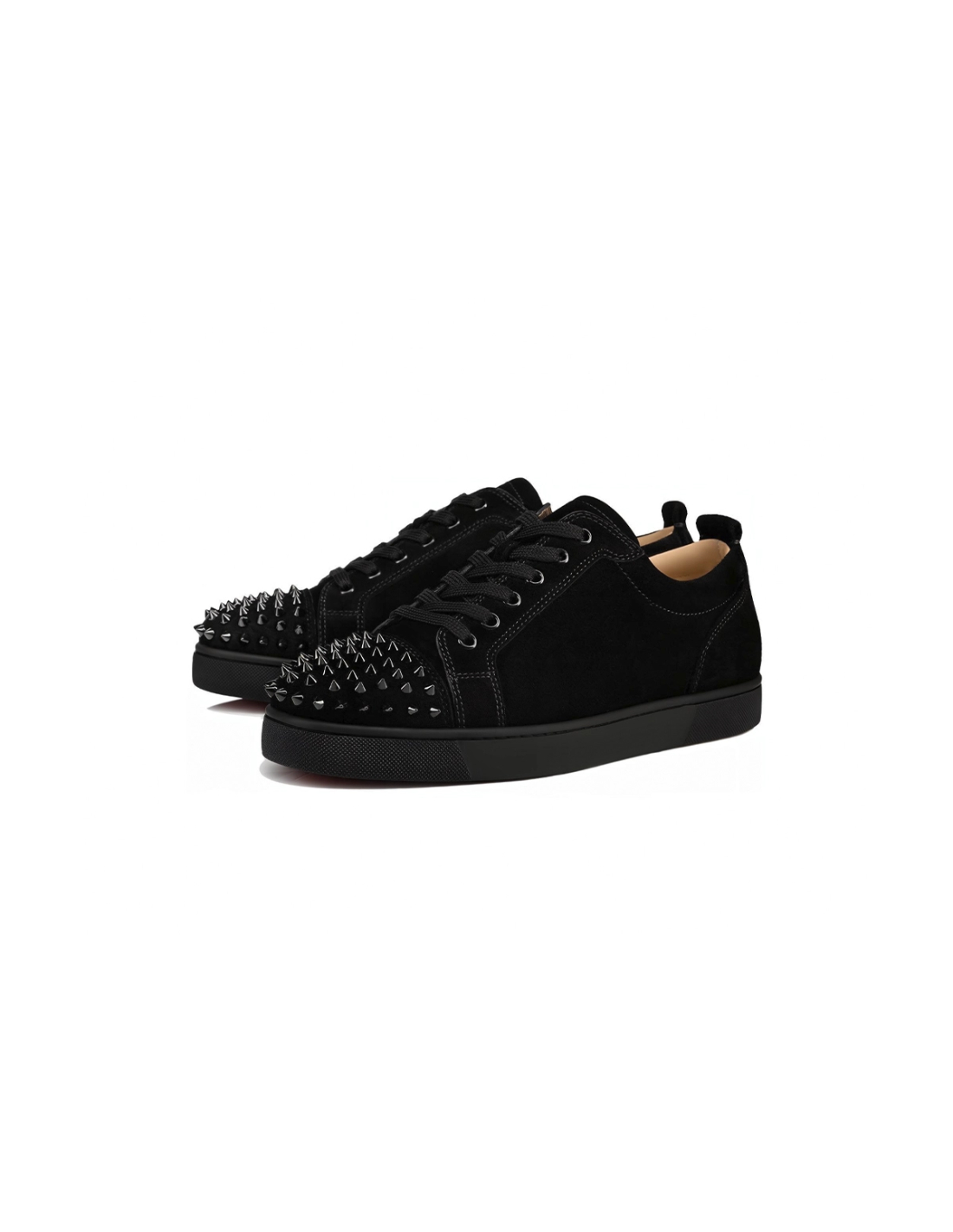 These iconic sneakers showcase Christian Louboutin's signature Louis Junior design with dramatic spike embellishments in a luxurious black veau velours finish. The silhouette features premium velour-like materials and the brand's iconic red lacquered sole, creating a perfect fusion of rebellious aesthetics and haute couture elegance.