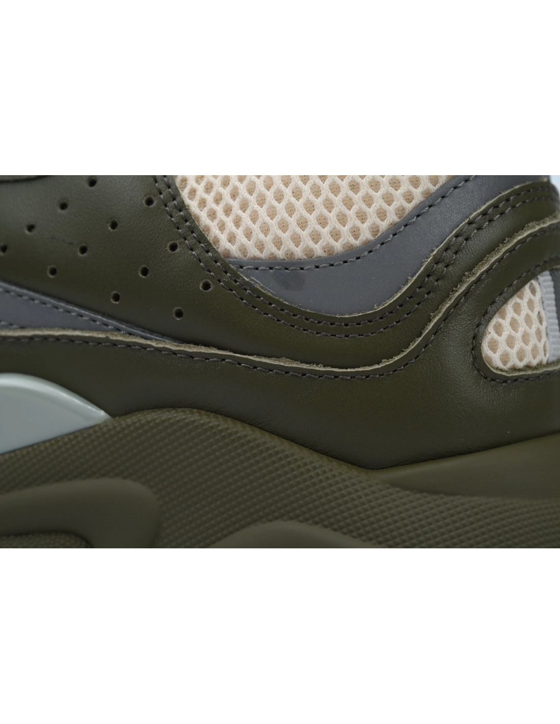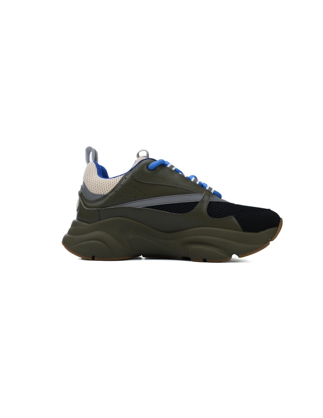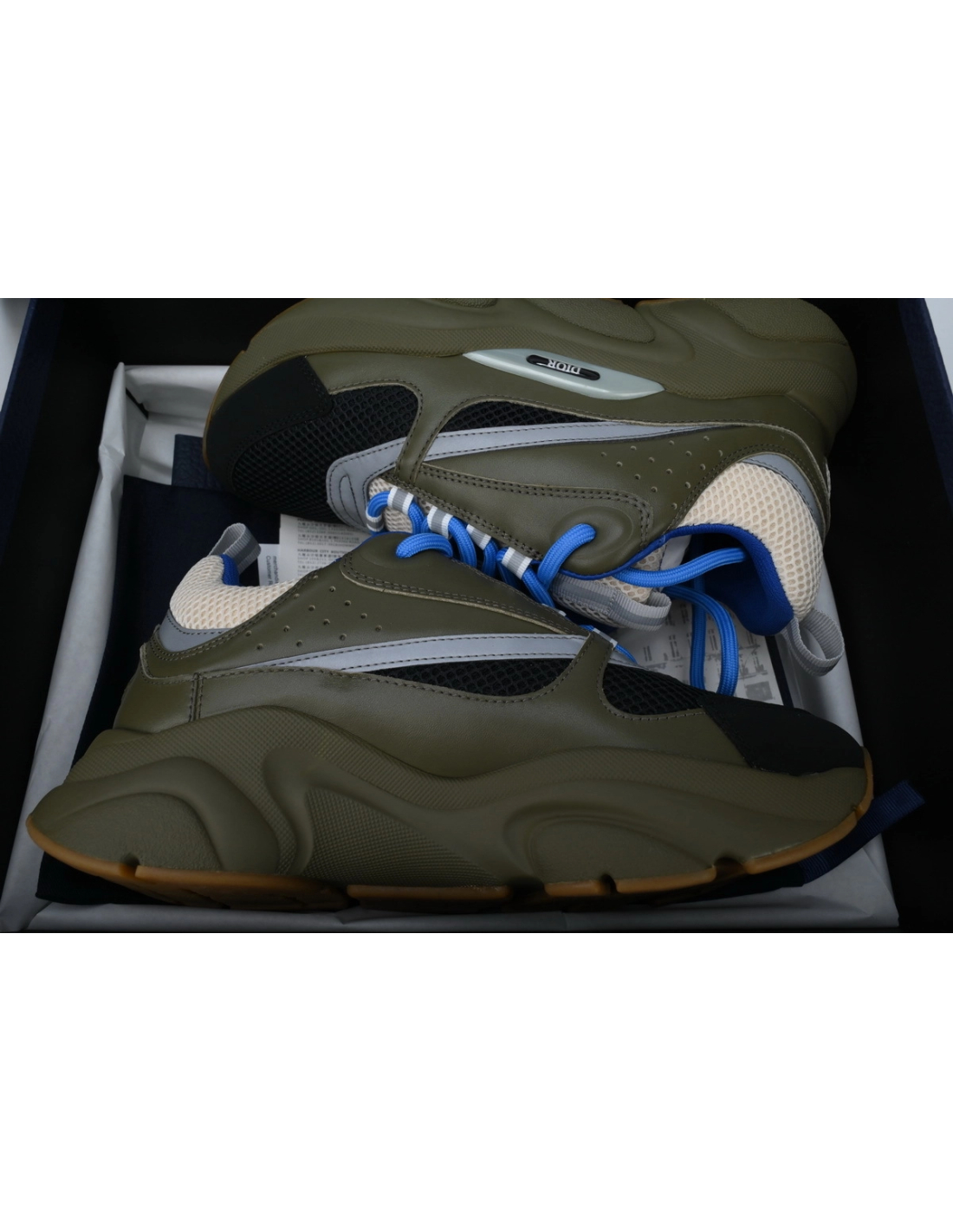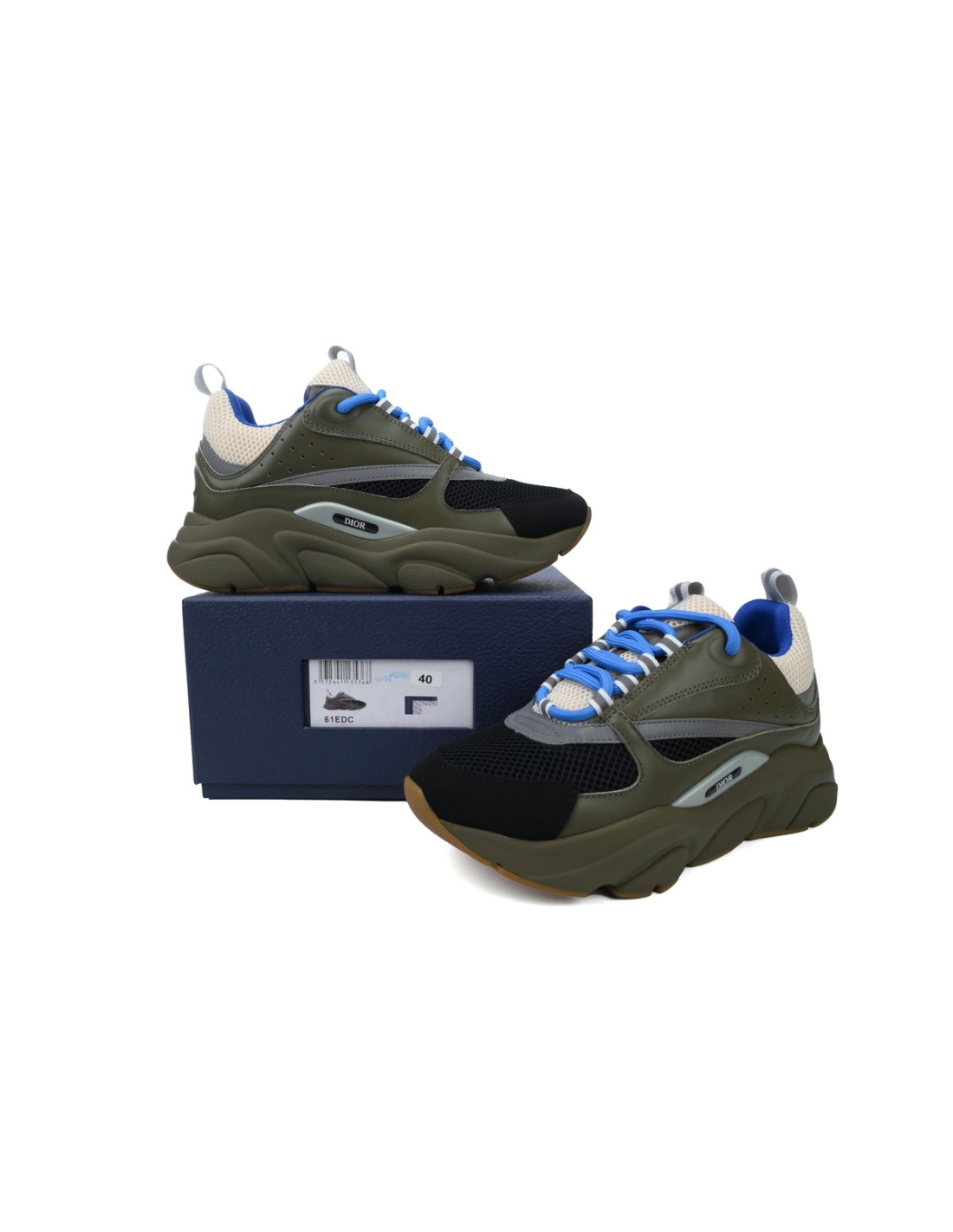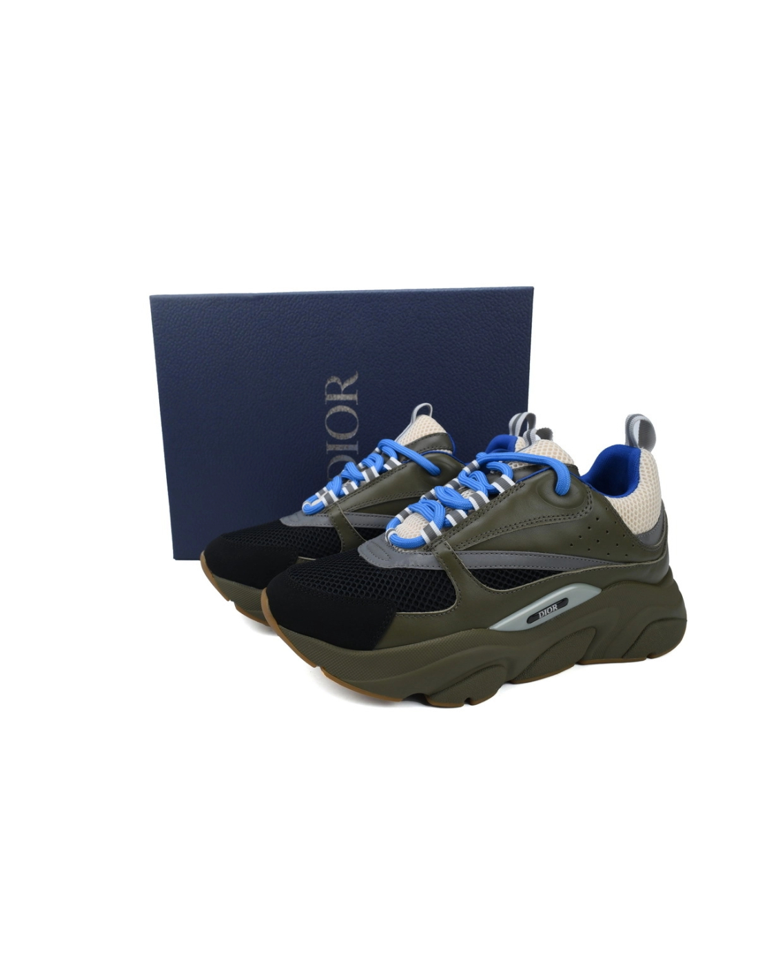 - Style DetailsColors: Cream / Black / Olive / BlueMaterial: Calfskin and technical meshDesign: Multi-layered construction with tonal and contrasting panelsSole: Thick, sculpted rubber sole for superior cushioning and tractionBranding: Embroidered "DIOR" logo on the side and tongueSizing: True to size; breathable and supportive