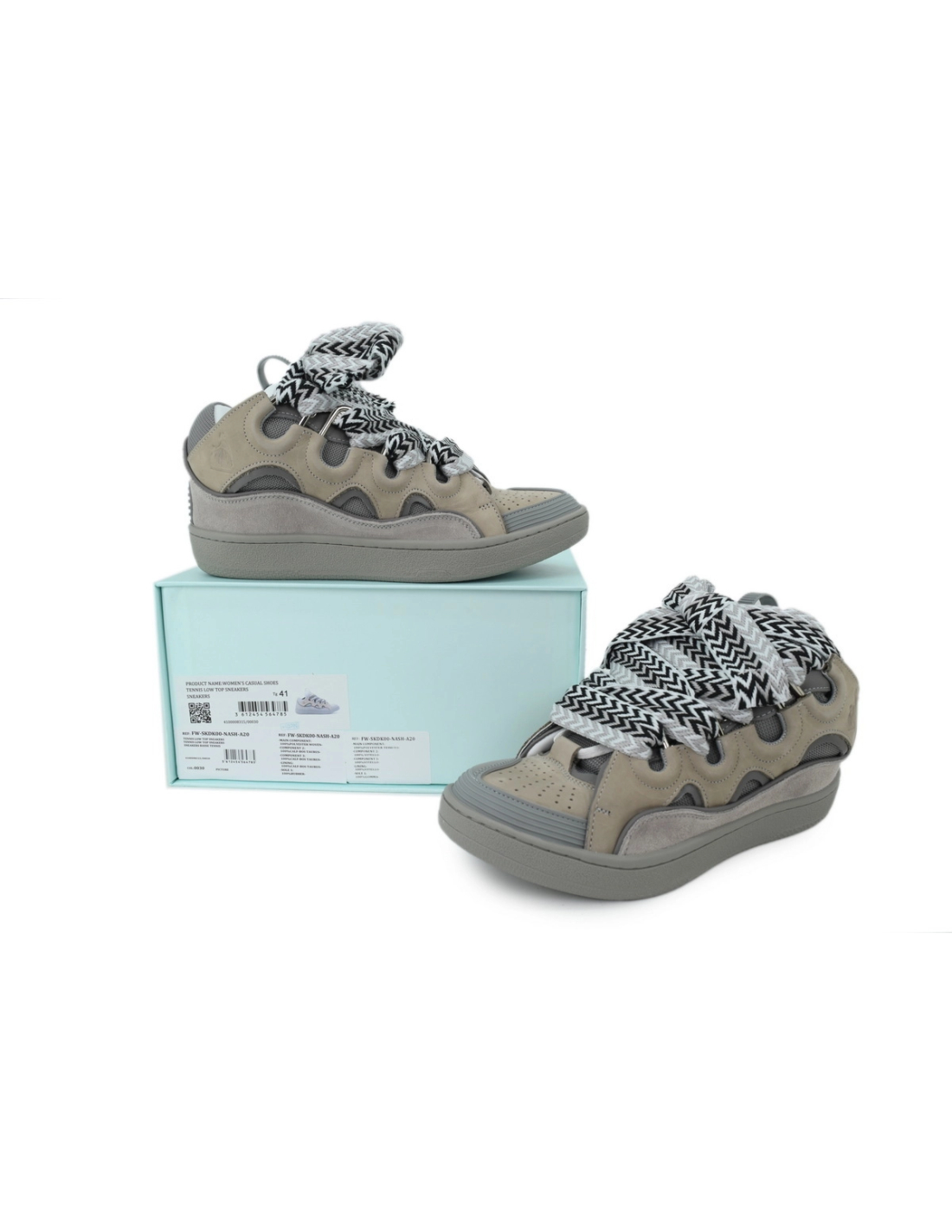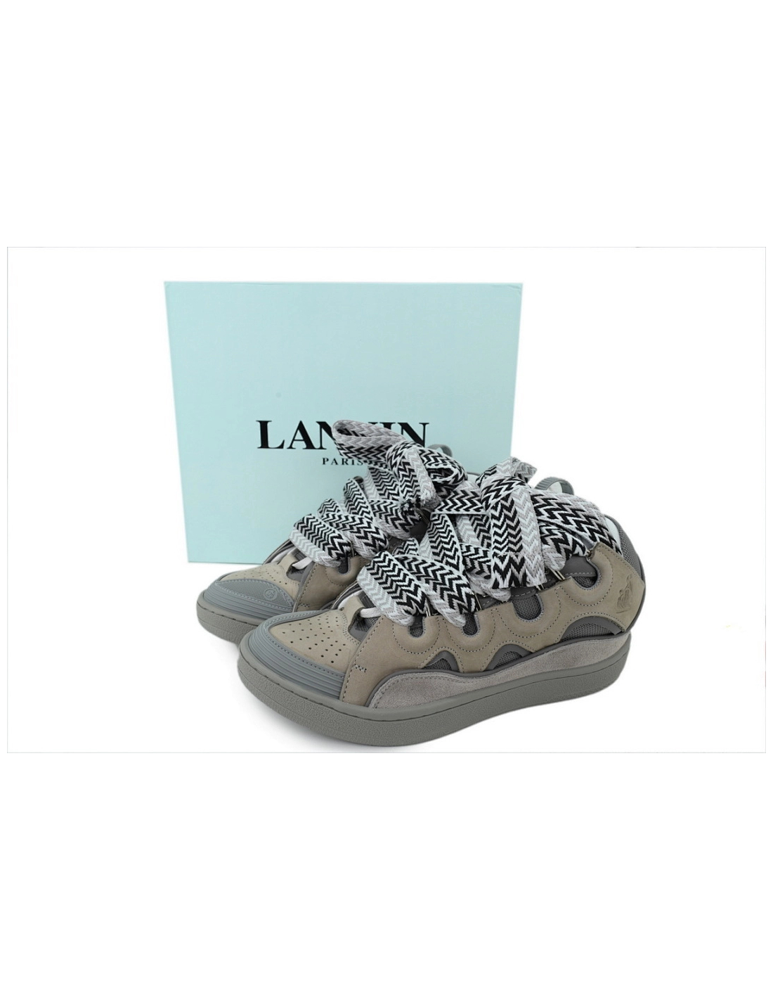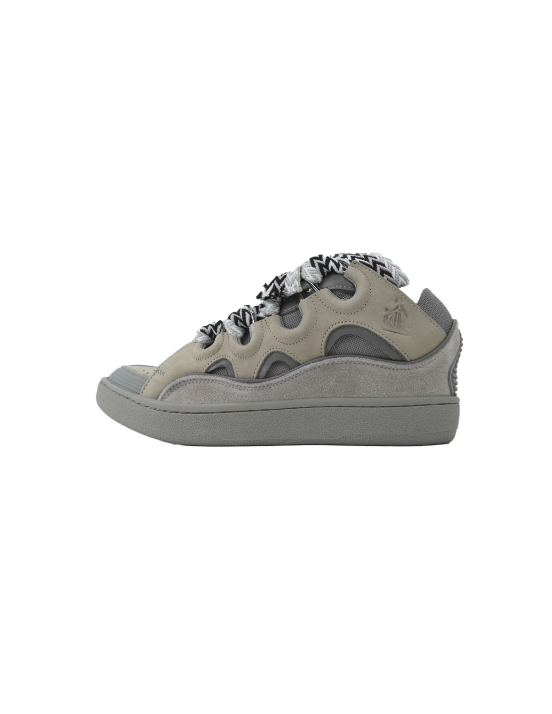 Discover the minimalist, deconstructed aesthetic of the Lanvin Curb Sneakers in Gray at Our Shoes. This model features a layered, paneled construction of varying shades of gray leather; its signature extra-wide laces and padded tongue define a bold, three-dimensional silhouette that embodies understated French luxury. Our high-quality "Reps" edition precisely replicates the shoe's intricate layering and artisanal details.