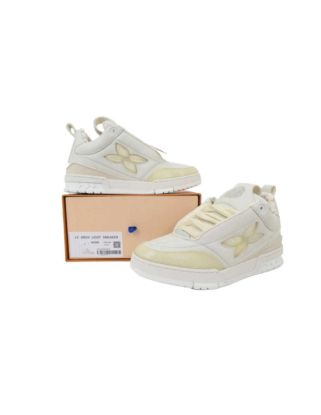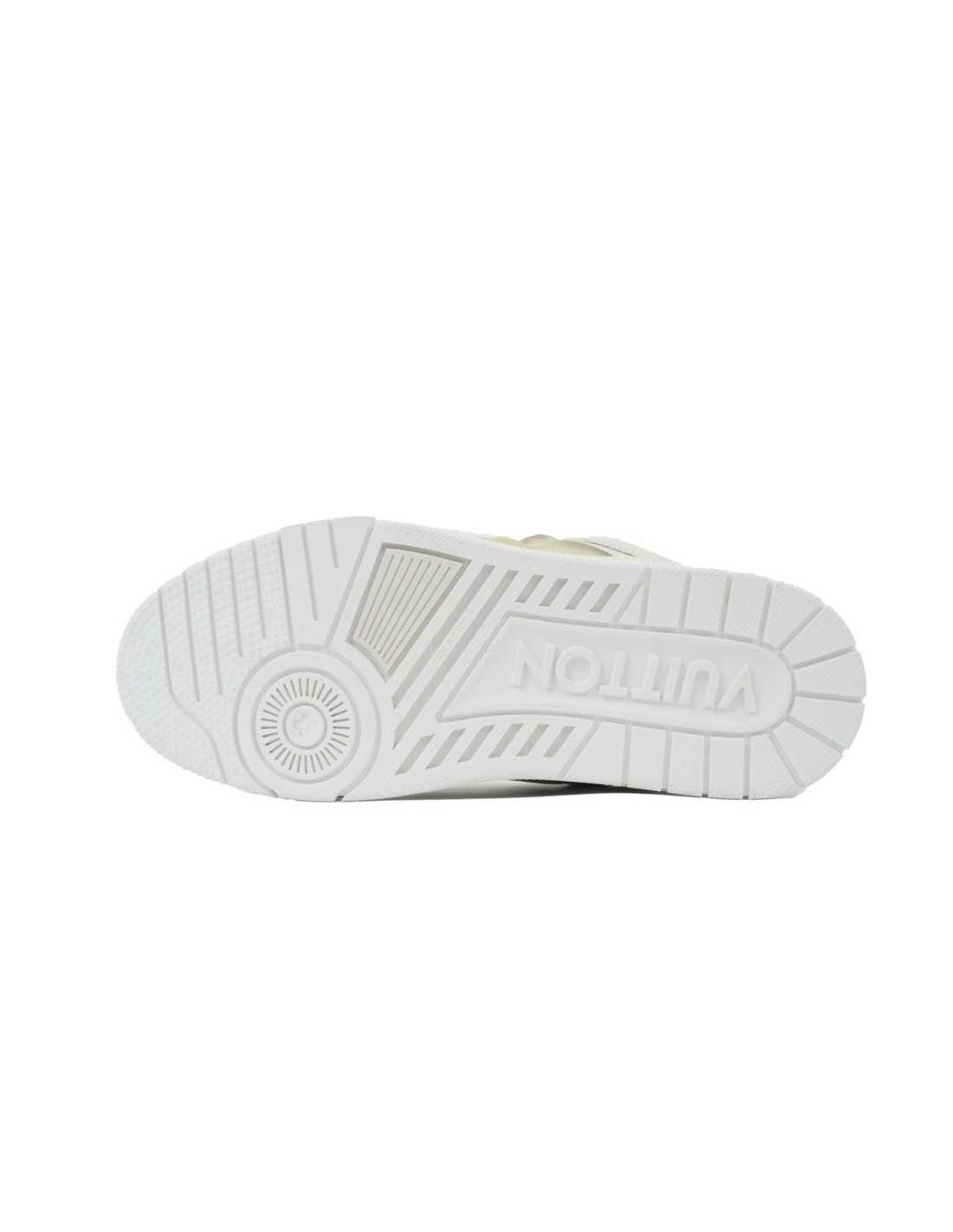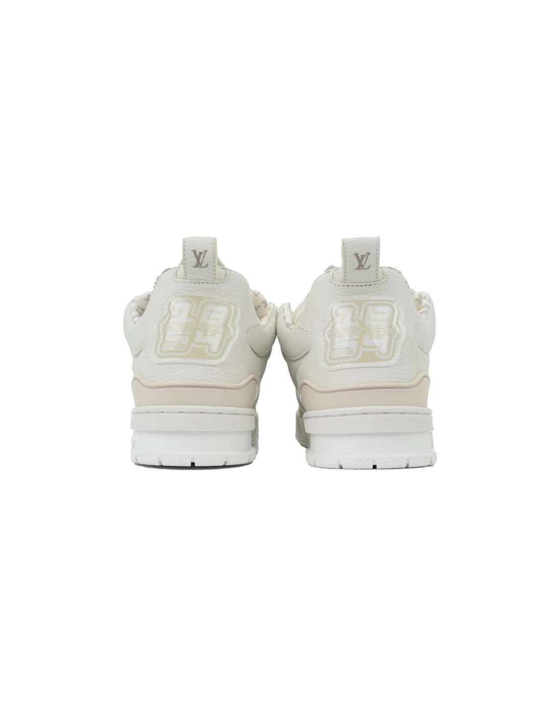 These premium skate-inspired sneakers elevate urban luxury with a pristine all-white finish and Louis Vuitton's iconic LV monogram details. The clean low-top design blends minimalist sophistication with streetwear versatility, creating a timeless statement for modern fashion collections.